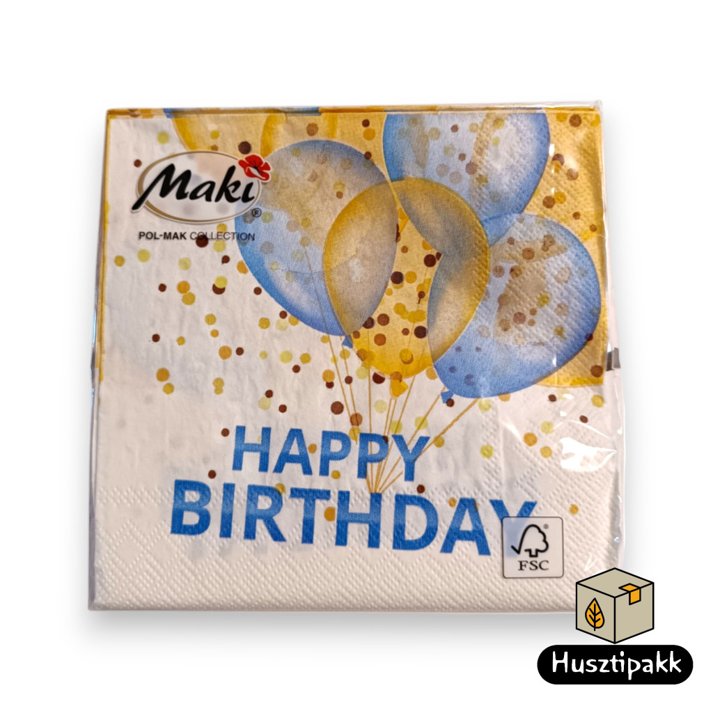 - Termék neve: Koktél szalvéta, HAPPY BIRTHDAY felirat kék lufikkal, 25x25 cm, 20 db/csomag